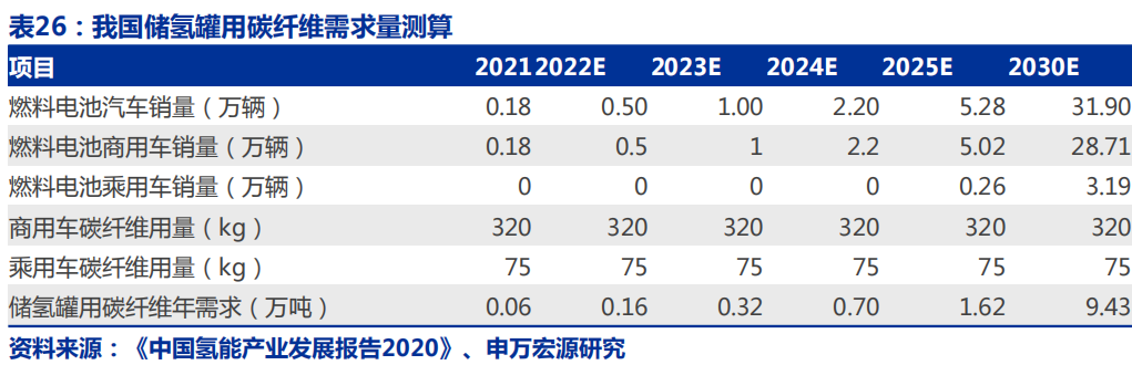 ̼ÏËάÊÇ´¢Çâ¹Þ×îΪÖ÷ÒªµÄÖÊÁÏ£¬¾ÝÃÀ¹úDOEÊý¾Ý£¬´¢Çâ¹Þ±¾Ç®Õ¼±ÈÁè¼Ý50%£¬³ËÓóµ´¢Çâ¹Þµ¥³µÓÃÁ¿Îª75kg£¬ÉÌÓóµ´¢Çâ¹Þµ¥³µÓÃÁ¿Îª320kg£¬½á ºÏ¡¶ÖÐ ¹ú Çâ ÄÜ ²ú Òµ ·¢ Õ¹ ±¨ ¸æ2020¡·£¬2025/2030Çâ ȼ ÁÏµç ³Ø Æû ³µ10/100ÍòÁ¾µÄÍýÏ룬ÎÒÃDzâËãµÃ³ö2025/2030ÄêÎÒ¹ú´¢Çâ¹ÞÓÃ̼ÏËάÐèÇóÁ¿¿É´ï1.62/9.43Íò¶Ö¡£¾Ý¡¶2020È«Çò̼ÏËά¸´ºÏÖÊÁÏÊг¡±¨¸æ¡·£¬È«Çò¹æÄ£ÄÚѹÁ¦ÈÝÆ÷̼ÏËάÐèÇó2025/2030Äê¿É´ï2.19/18Íò¶Ö¡£